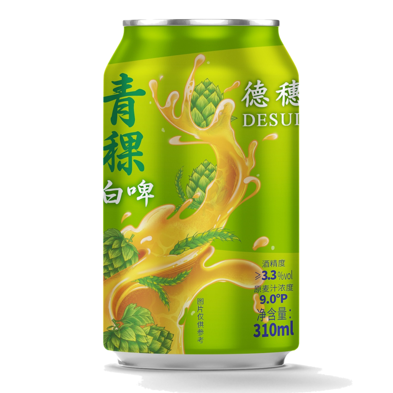 德穗310ml铝罐原浆;原料:水、麦芽、啤酒花、酵母;原麦汁浓度:12 oP,酒精度:5.0% vol,保质期:12个月; 原浆啤酒、离心工艺、不勾兑、不稀释;执行标准:GB/T 4927;